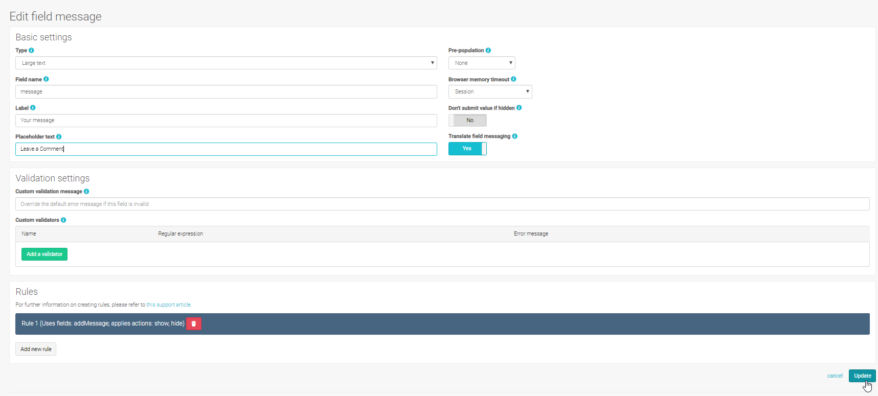 After adding content like placeholder text and updating, users return to the Manage Fields area to activate Preview Mode. An active Preview Mode displays a confirmation message.