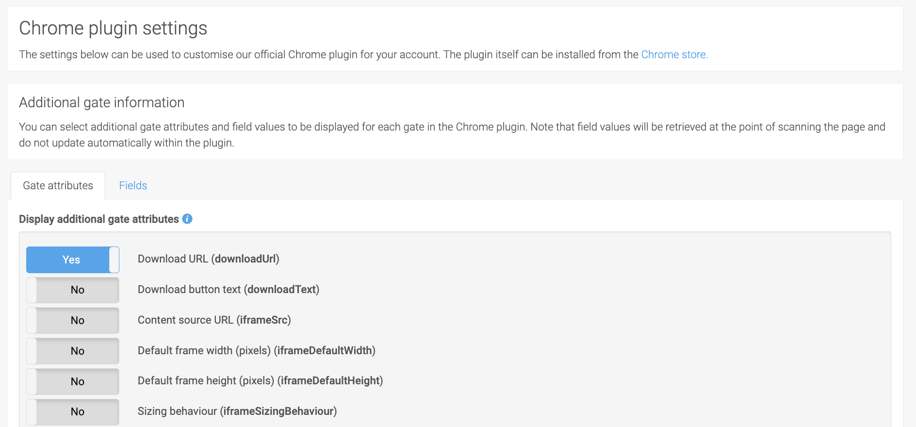 The chrome plugin settings can be used to customise our official Chrome plugin for your account. To find these goto Setup>Settings>Chrome Plugin. From here you can you can select which gate attribute values should be displayed for gates listed by the plugin. Note that the gate name, form type, gate type and language are always displayed.